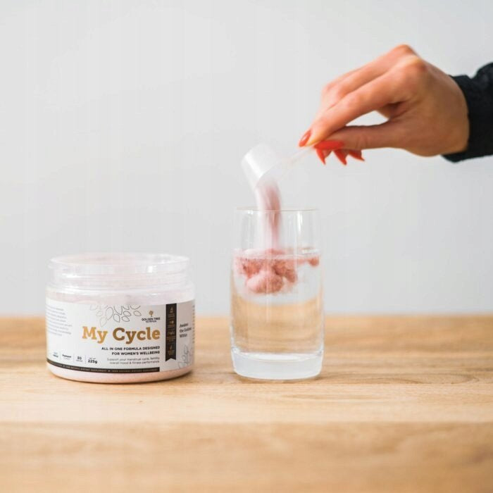 Golden Tree My Cycle to suplement diety w proszku: wystarczy wymieszać go z wodą i wypić. Przygotowany napój charakteryzują przyjemny smak i doskonała rozpuszczalność.