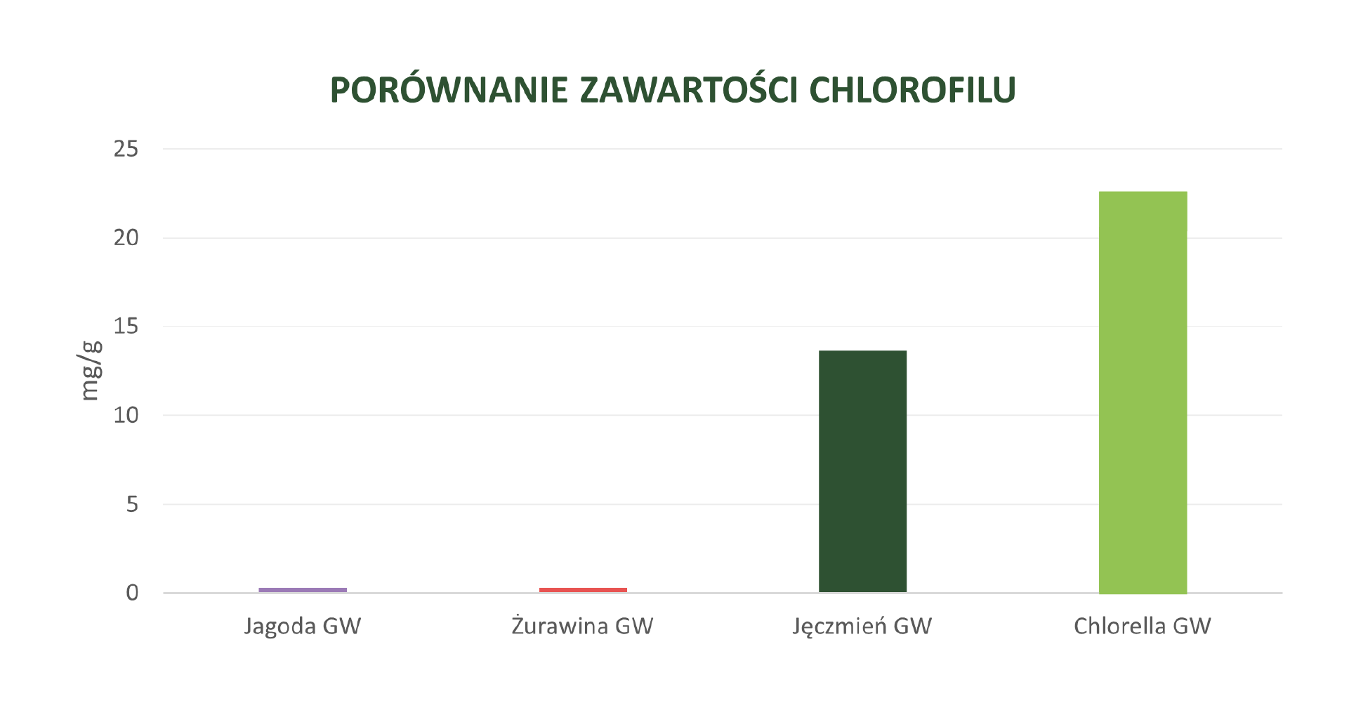 Chlorella należy do najbogatszych źródeł chlorofilu, zielonego barwnika, niezbędnego do fotosyntezy. Wysokiej zawartości tego barwnika Chlorella zawdzięcza swój kolor, a także nazwę (chloros = zielony). Dodatkowo jest dobrym wskaźnikiem zdolności do życia i ogólnej kondycji Chlorelli. Jeśli komórki mają niską zawartość chlorofilu, jest to znakiem jakiegoś biologicznego, niedoboru wody lub jej złej jakości, braku światła słonecznego lub stresu odżywczego. Komórki zaczynają cierpieć i stopniowo się degenerują.