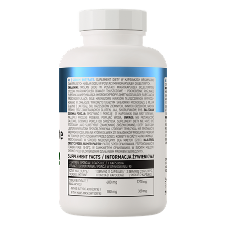 - Źródło maślanu sodu - jedna porcja suplementu diety dostarcza do organizmu 600 mg maślanu sodu, który zawiera 30% kwasu masłowego.