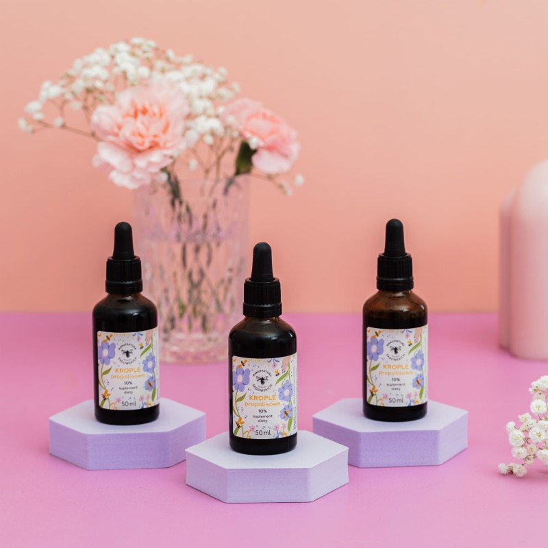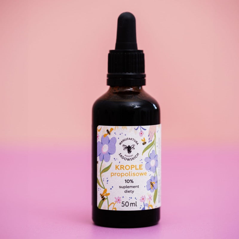 Nasz nowy suplement diety, Krople propolisowe 10%, to prawdziwa pszczela moc zamknięta w buteleczce ekstraktu z propolisu o pojemności 50 ml! Krople te bazują na prawdziwym skarbie prosto z ula - propolisie. Nasze skrzydlate przyjaciółki wytwarzają go z żywic, substancji tłuszczowych, balsamicznych zbieranych z młodych pędów roślin, kory drzew liściastych czy iglastych. Naturalne skarby zbierają nasze pszczele robotnice, a następnie transportują je do ula. Tam rozpoczyna się prawdziwa magia! Dzielne pszczoły pracują nad dostarczonym materiałem, dodając do niego pyłek pszczeli, nazywany też kwiatowym i wosk pszczeli. Propolis wytwarzany przez pszczoły to prawdziwy “cement”, który wzmacnia konstrukcję, wypełnia otwory i szpary w ulu. Pełni również tarczę ochronną chroniącą pszczoły przed rozwojem drobnoustrojów i zanieczyszczeniami z zewnątrz. Krople propolisowe 10% są idealnym produktem dla każdego, kto chce prowadzić zdrowy tryb życia.