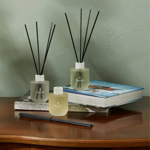 Zestaw zawiera stylową buteleczkę z mrożonego szkła z polskiej huty oraz 8 chłonnych, czarnych patyczków.
