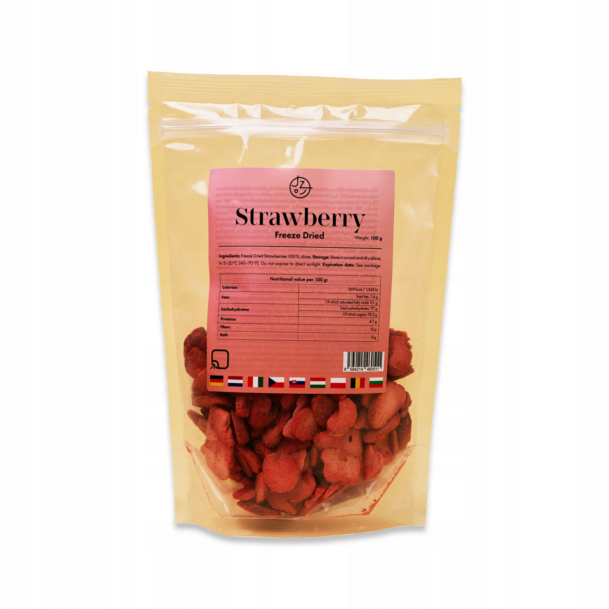 Liofilizacja to proces suszenia owoców przez ich zamrażanie w próżni. W procesie tym usuwane jest aż 99% wody. Owoce zachowują jednak wszystkie wartości odżywcze, smak i aromat. Są również bardziej chrupkie niż owoce suszone w sposób tradycyjny. Truskawki zakonserwowane mrozem są smaczne i pełne witamin i minerałów, bez dodatku sztucznych konserwantów i cukru. Sama natura! Pozostaną smaczne przez 2 lata, chociaż nie wierzymy, że ostaną się u Ciebie tak długo.