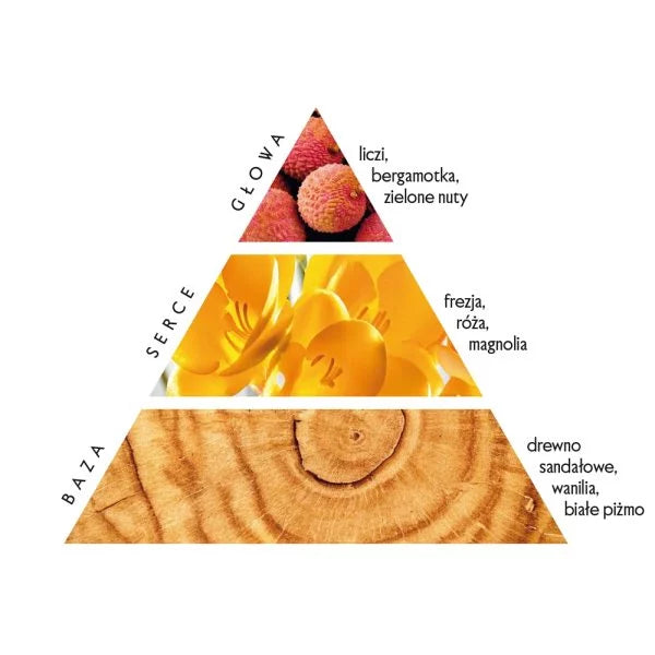 Otwarcie perfum rozbrzmiewa soczystym, egzotycznym liczi, którego słodycz przełamuje musująca bergamotka i orzeźwiające zielone akordy. W sercu kompozycji rozkwitają delikatne płatki frezji, róży i magnolii, dodając kompozycji romantycznej elegancji. Całość spoczywa na głębokiej, kojącej bazie – kremowy sandałowiec łączy z miękkim cedrem, wanilią i subtelnym białym piżmem, otulając skórę ciepłem i zmysłowością.